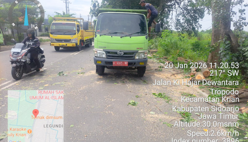 Kegiatan pemangkasan atau pengeprasan pohon pelindung di ruas jalan provinsi (di bawah wilayah UPT PJJ Surabaya 1) pada ruas Krian–Mojosari, tepatnya di Desa Tropodo, Kecamatan Krian, telah berlangsung selama dua hari, sejak Senin (19/1/2026) hingga Selasa (20/1/2026).