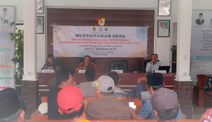 JEMBER, Sadap99.com – Badan Permusyawaratan Desa (BPD) Sidomukti, Kecamatan Mayang, Kabupaten Jember, menyelenggarakan Musyawarah Desa (Musdes) pada Selasa pagi (30/09/25). Acara yang berlangsung di Pendopo Balai Desa Sidomukti ini mengagendakan penyempurnaan Rancangan Rencana Kerja Pemerintah (RKP) Desa Tahun 2026 dan penyusunan Daftar Usulan (DU) RKP Desa Tahun 2027.