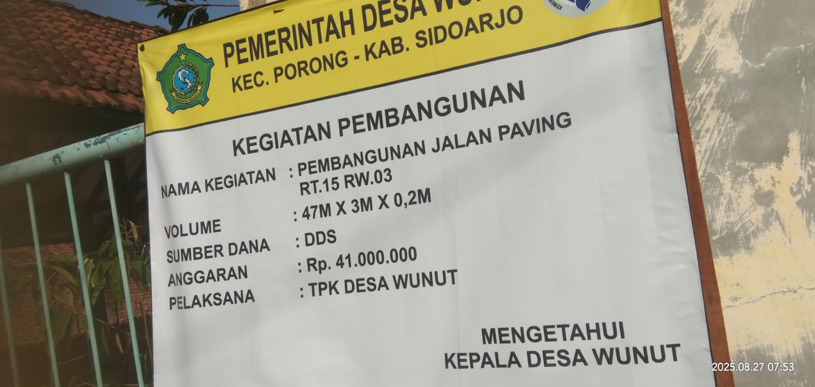 Sejumlah kegiatan pembangunan di Desa Wunut, Kecamatan Porong, diduga kuat mengalami mark-up atau penggelembungan biaya. Salah satu yang mencolok adalah proyek pavingisasi di RT 15 RW 03 yang menggunakan Dana Desa senilai Rp 41.000.000. Pada papan informasi proyek, tahun anggaran kegiatan tersebut tidak disebutkan.