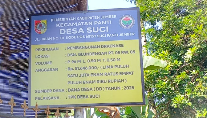 Pembangunan infrastruktur drainase di RT 05/RW 05, Dusun Glundengan, Desa Suci, Kecamatan Panti, Kabupaten Jember, menuai sorotan. Proyek yang dibiayai Dana Desa (DD) Tahun Anggaran 2025 ini diragukan kualitas pengerjaannya, khususnya pada komposisi campuran material yang digunakan.