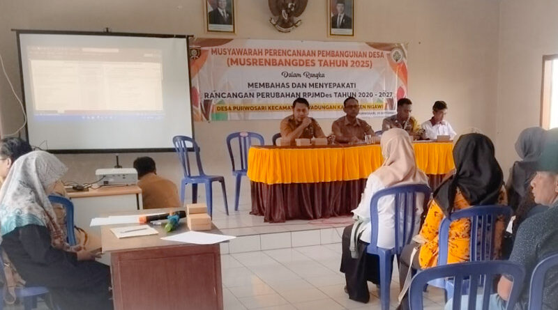 Desa Purwosari, Kecamatan Kwadungan, Kabupaten Ngawi, telah melaksanakan Musyawarah Perencanaan dan Pembangunan Desa (Musrenbangdes) Tahun Anggaran 2025 pada Senin, 29 September. Acara yang diselenggarakan di Aula Balai Desa Purwosari ini berlangsung dari pukul 09.00 WIB hingga 12.00 WIB dan dipimpin secara langsung oleh Kepala Desa Purwosari, Suyono.