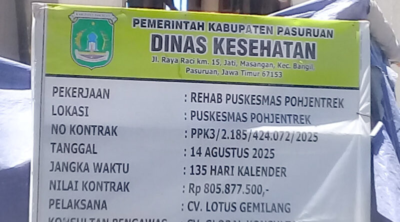 Proyek rehabilitasi Puskesmas Pohjentrek di Kabupaten Pasuruan diduga menyimpan sejumlah penyimpangan. Proyek senilai Rp805.877.500 ini dikerjakan oleh CV Lotus Gemilang dengan CV Global Konsultan sebagai pengawas. Pekerjaan dimulai pada 14 Agustus 2025 dan ditargetkan selesai dalam 135 hari kalender.