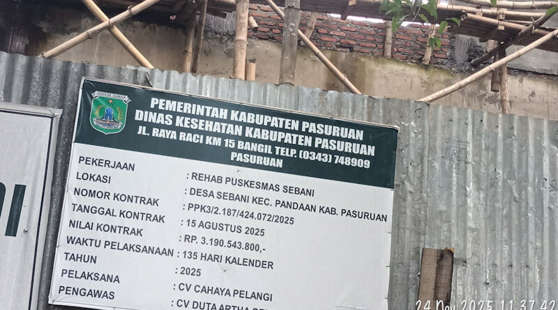 Proyek pembangunan di Kabupaten Pasuruan kembali menjadi sorotan. Kali ini, rehabilitasi Puskesmas Sebani di Kecamatan Pandaan diduga tidak sesuai dengan standar nasional.