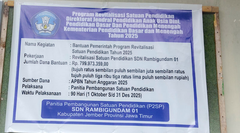 Proyek revitalisasi di SD Negeri Rambigundam 01, Kecamatan Rambipuji, Kabupaten Jember, menjadi sorotan. Program yang menggunakan dana APBN sebesar Rp 799.973.359,00 untuk Tahun Anggaran 2025 ini direncanakan terealisasi dalam 90 hari, mulai 1 Oktober hingga 31 Desember 2025. Namun, pelaksanaannya diduga menyimpang dari aturan.